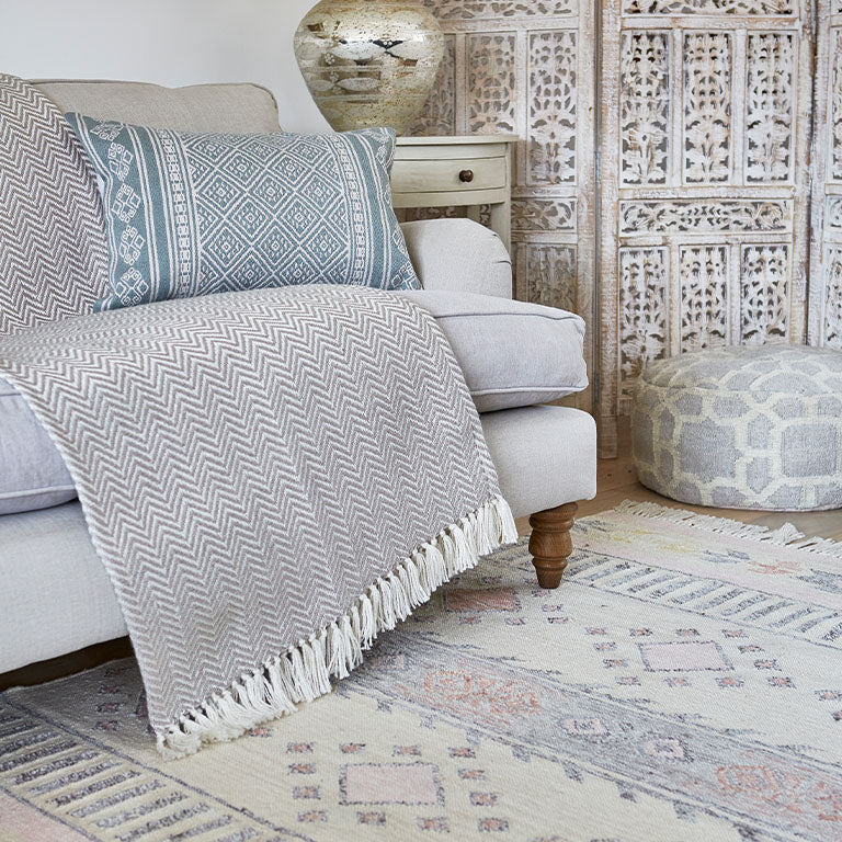 If the focal point of your room is a statement piece of furniture or a one of our bold bohemian rugs, it's best to let the blankets and accessories take a back seat.
