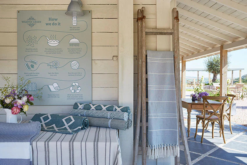 At Weaver Green, we design beautiful, practical textiles made from recycled plastic. Soft and durable, every piece is crafted with care and full of thoughtful detail, made to be lived with, loved, and last through everyday life.