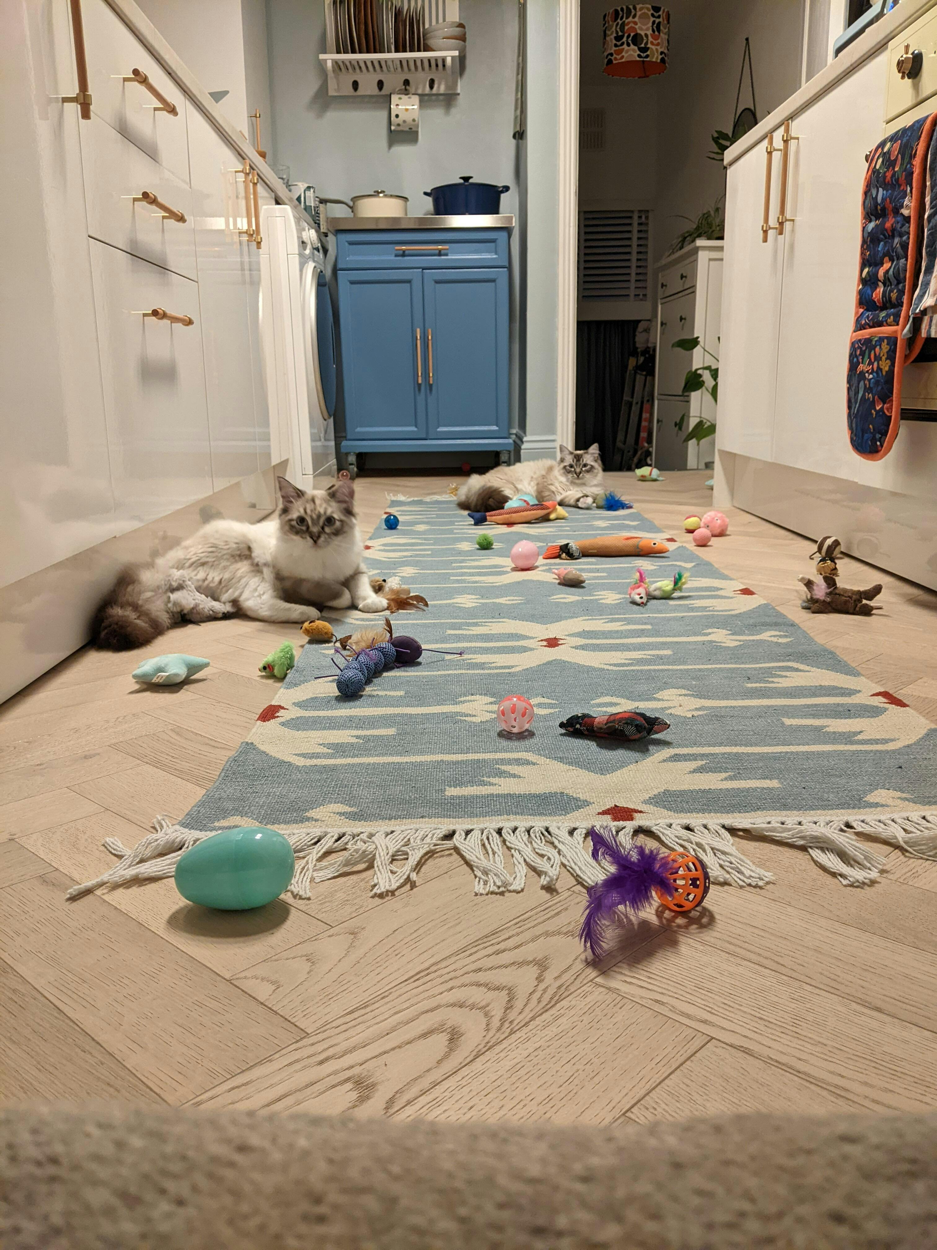 It lovely being able to choose a light colored rug (sky blue) for the kitchen, knowing that we can throw it in the washing machine when it gets the inevitable food layer.
