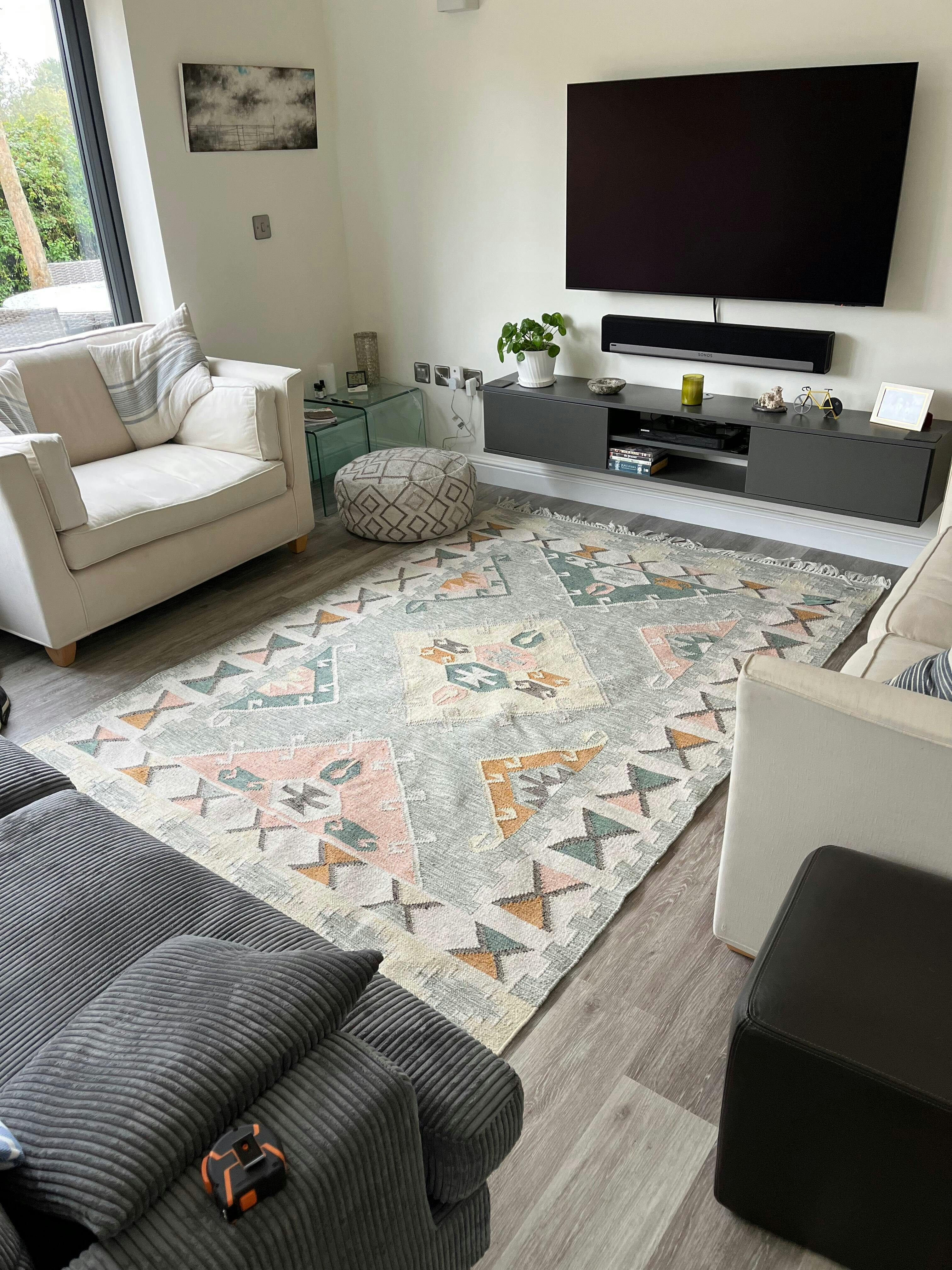 To achieve a fabulously framed look, leave 20–60 cm of exposed floor around the edges of your rug (depending on the size of your room).