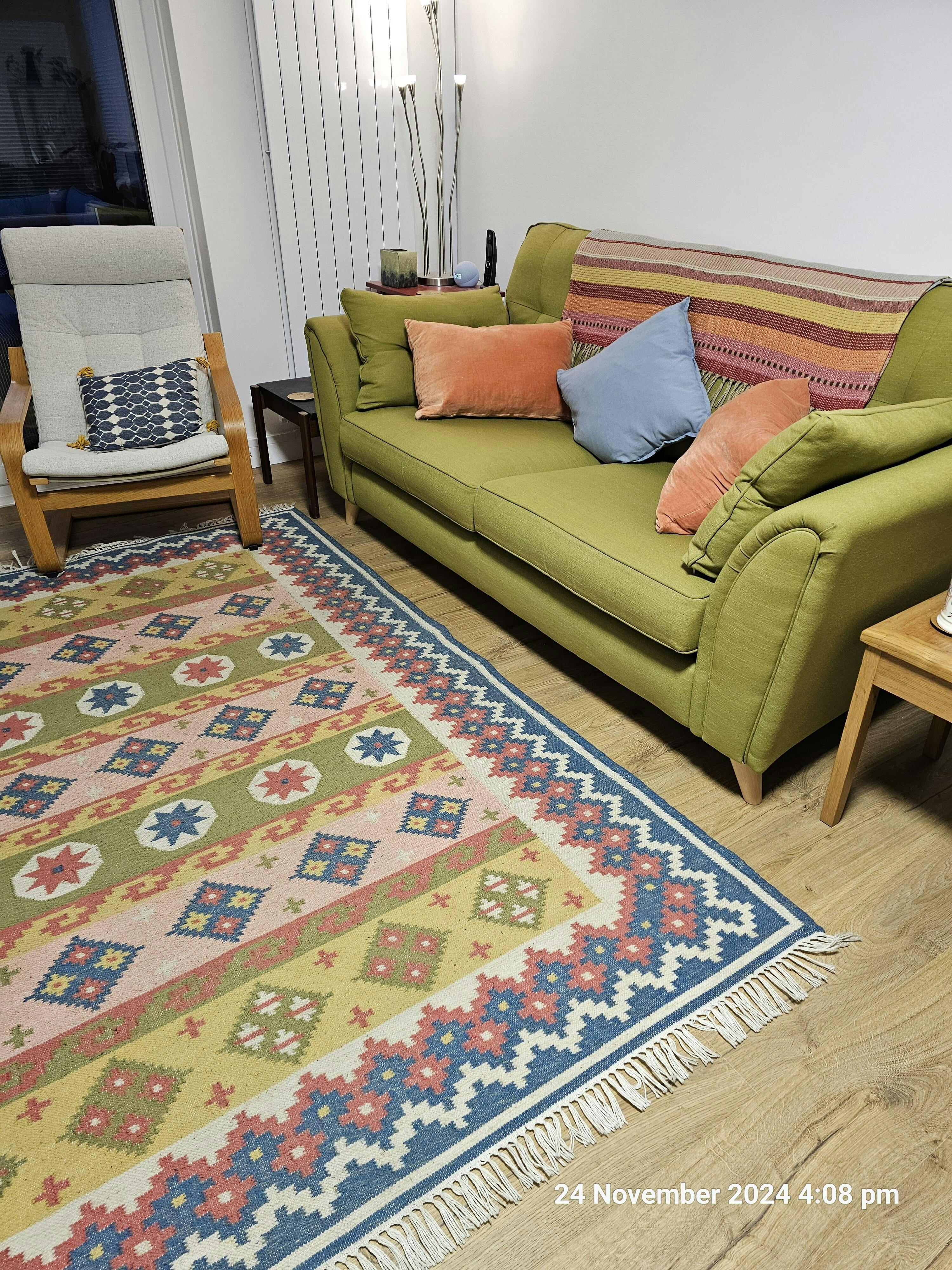 Featuring a gorgeous, intricate, multi-bordered kilim weave in soft pinks, olive and saffron, edged in a washed-out denim blue.