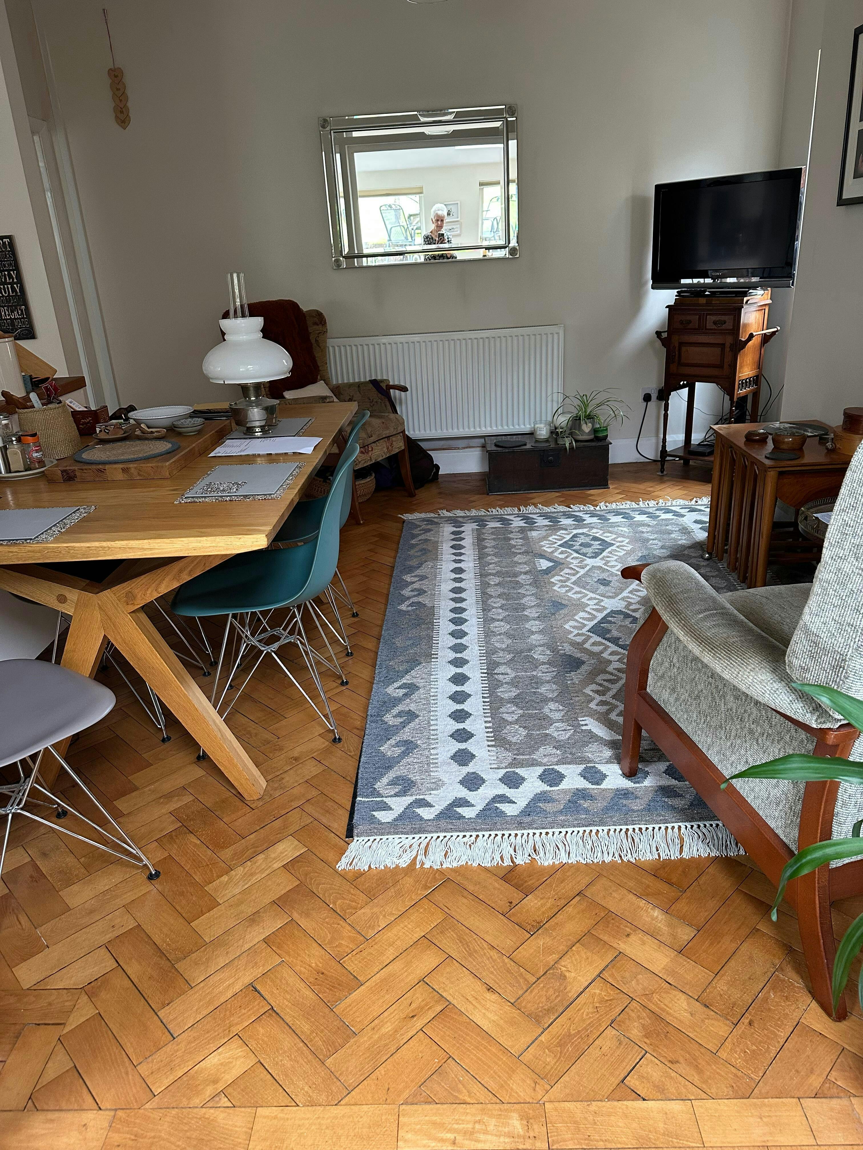 To avoid wobbly legs (from uneven flooring not red wine) a rug should comfortably extend beyond your chairs, leaving extra room for leaping up and down from the table when you've forgotten that extra spoon. And don't worry about any accidental spills - all our rugs are machine washable.